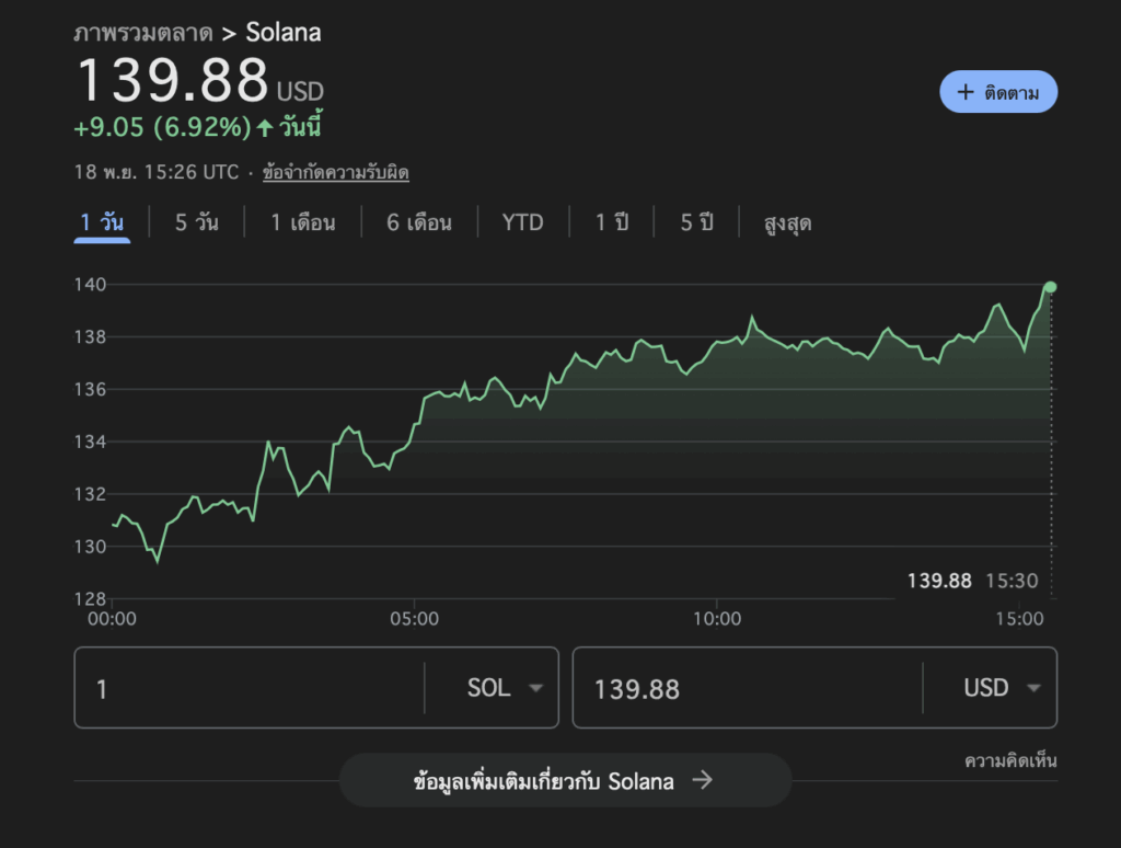 ในขณะที่ตลาดคริปโตกำลังเผชิญกับการปรับฐาน โดยเฉพาะกองทุน Bitcoin (BTC) และ Ethereum (ETH) ETF ที่ประสบภาวะเงินทุนไหลออกอย่างต่อเนื่อง เหรียญ Solana (SOL) กลับแสดงความแข็งแกร่งอย่างโดดเด่น ด้วยราคาที่พุ่งสูงขึ้นถึง 6.92% แตะระดับ $139.88 ในการซื้อขายวันที่ 18 พฤศจิกายน 2025