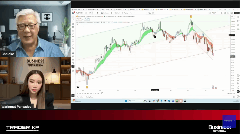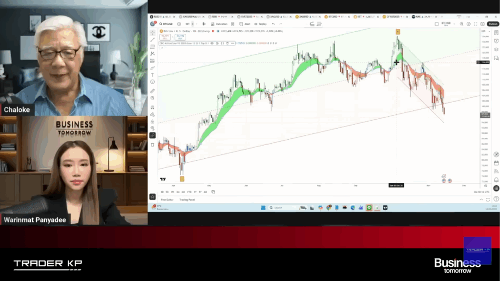 เมื่อผู้ดำเนินรายการ ถามว่า Bitcoin หลุด 1 แสนดอลลาร์ลงมาแล้ว ช่วยดูกราฟเทคนิคหน่อยได้ไหมคะว่า ตอนนี้เป็นยังไงบ้าง ระยะสั้นค่ะ