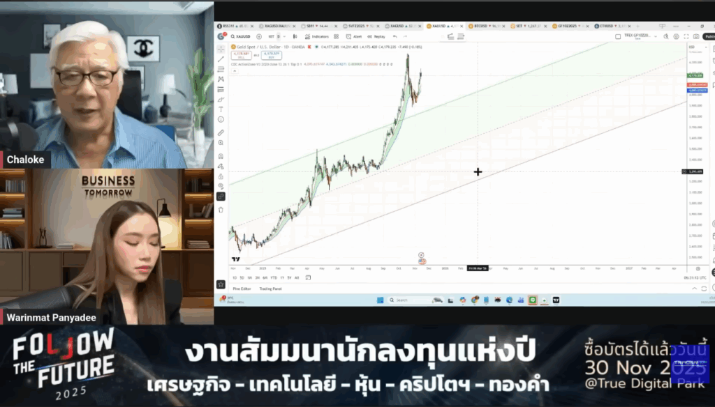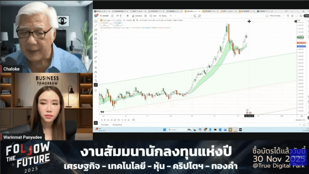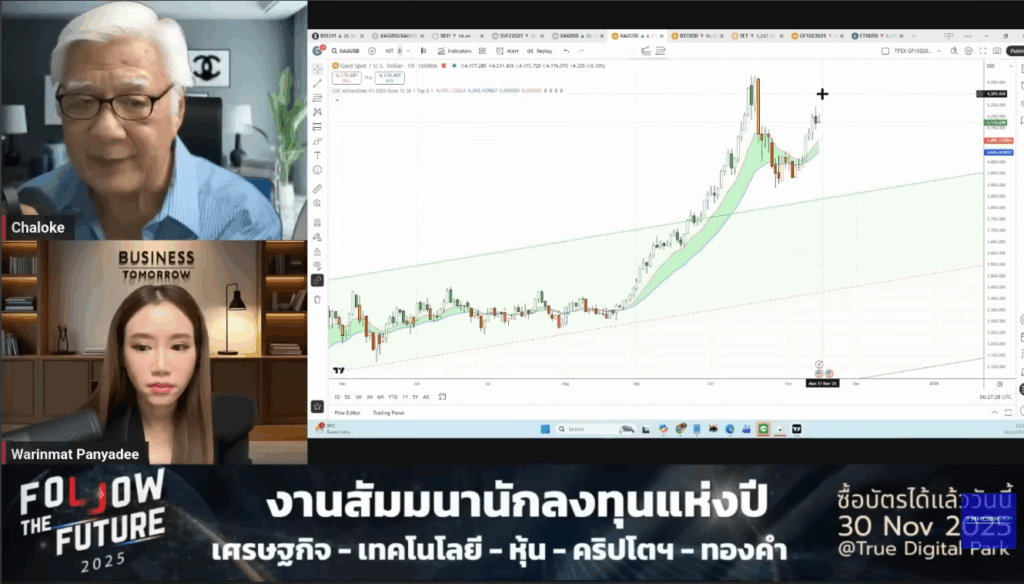 รวมถึงยังร่วมพูดคุยในหัวข้อ “ทองคำหมดแรง…ไม่สามารถทำสูงได้อีกนาน ?” เมื่อวันที่ 16 พฤศจิกายน โดยได้วิเคราะห์แนวโน้มราคาของทองคำ ผ่านการดูกราฟเทคนิคอีกด้วย