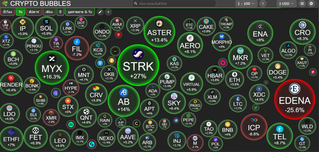 นอกจากนี้ ยังมีเหรียญอื่น ๆ ที่ปรับตัวขึ้นตามมาติด ๆ เช่น STRK ราคาเพิ่มขึ้น 27% , MYX ราคาเพิ่มขึ้น 16.3 % , และ AB ราคาเพิ่มขึ้น 14% ซึ่งสะท้อนให้เห็นว่า นักลงทุนเริ่มกลับมาเก็งกำไรในเหรียญที่ที่มีพื้นฐานและปัจจัยบวกกันมากขึ้น