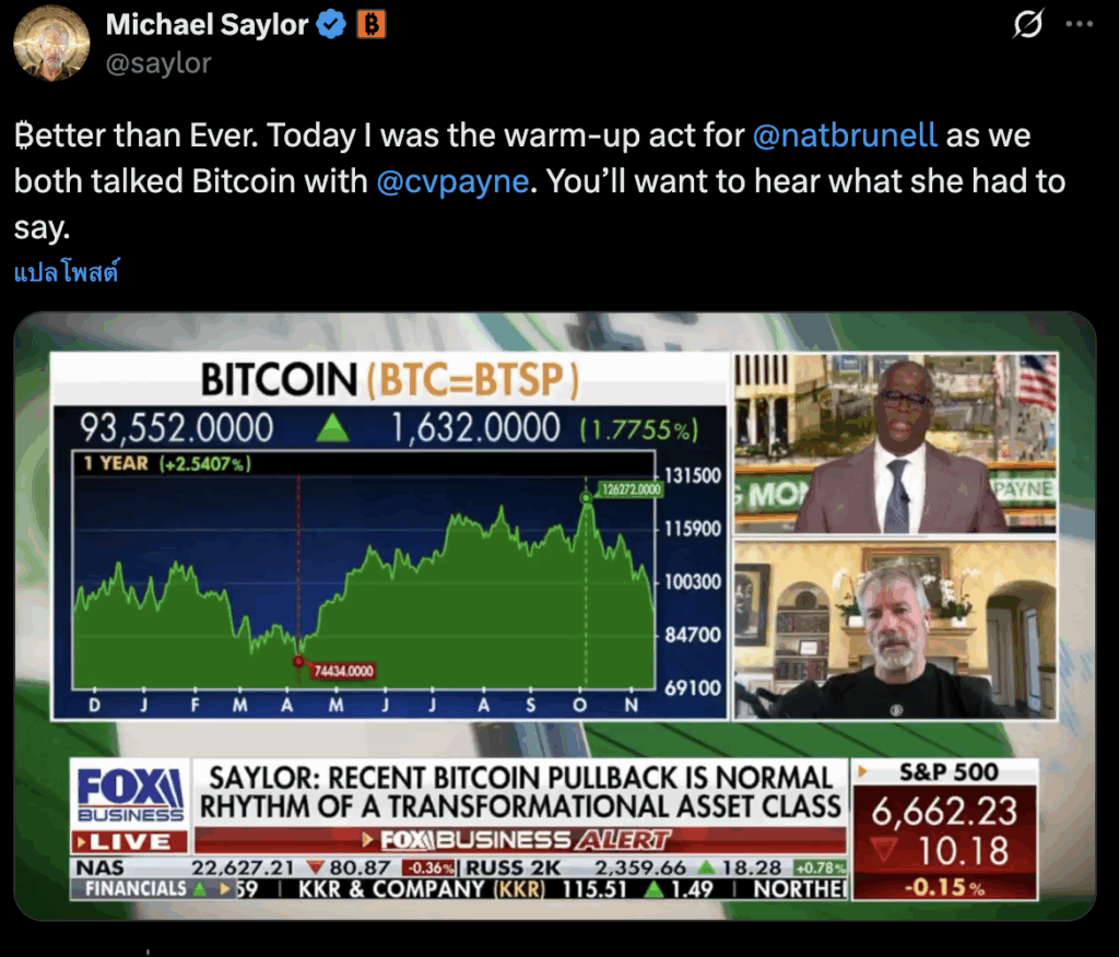 Michael Saylor ประธาน Strategy บริษัทที่มีการสะสม Bitcoin ในงบดุลไว้มากที่สุดในโลก ล่าสุด ได้ให้สัมภาษณ์กับ Fox Business ถึงมุมมองของเขาต่อสถานการณ์ในปัจจุบันที่ราคา Bitcoin ร่วงลงอย่างหนัก