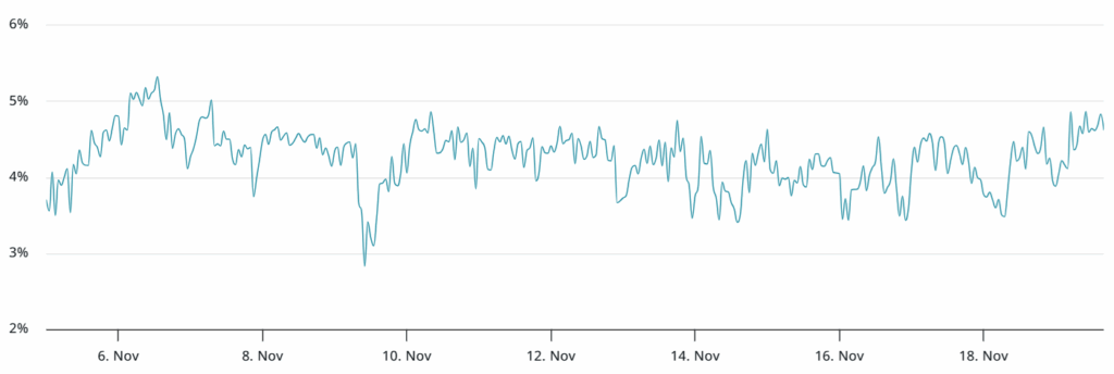 Monthly Futures Premium (ส่วนต่างราคาสัญญาซื้อขายล่วงหน้ารายเดือน) ของ Bitcoin ยังคงอยู่ที่ราว 4% ซึ่งถือว่าใกล้เคียงระดับกลาง 5% แม้ว่าจะมีรายงานว่า ค่าพรีเมียมติดลบในช่วงที่ราคา Bitcoin ร่วงหลุด $89,200 ดอลลาร์ แต่ข้อมูลรวมจากหลายกระดานเทรดยังบ่งชี้ว่า ยังไม่ถึงขั้นติดลบจริงจัง