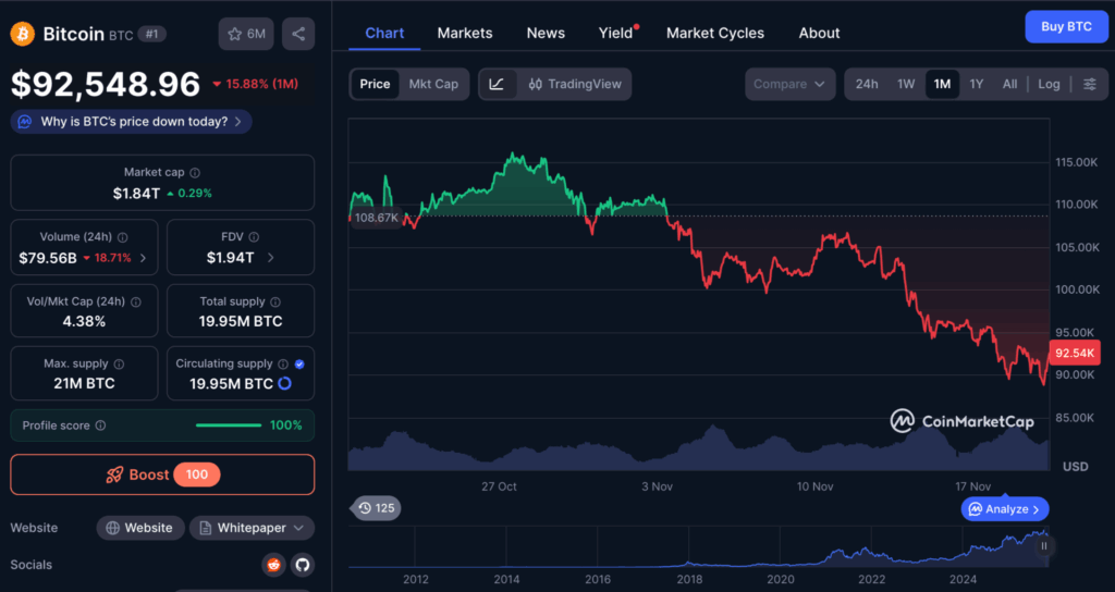 ในขณะที่รายงาน ราคา Bitcoin กำลังซื้อขายอยู่ที่ 92,548 ดอลลาร์ ลดลง 15.88% ภายใน 24 ชั่วโมง อ้างอิงข้อมูลจาก coinmarketcap