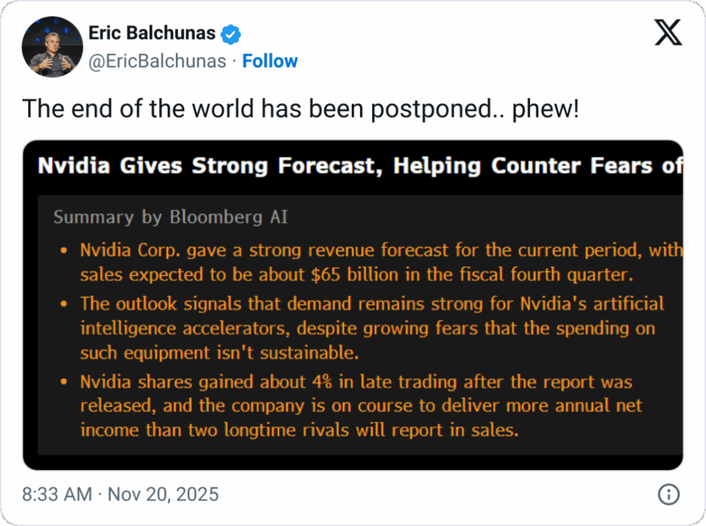 ในช่วงคืนที่ผ่านมา Nvidia ได้รายงานผลประกอบการไตรมาสที่ 3 ซึ่งนักลงทุนส่วนใหญ่ต่างกังวลว่าจะเป็นจุดเริ่มต้นของฟองสบู่ AI แต่ผลกลับตรงกันข้ามเพราะทางบริษัทกลับทำกำไรได้ทะลุเป้า