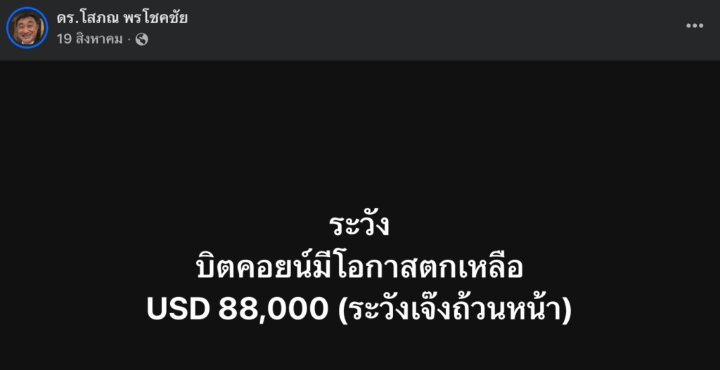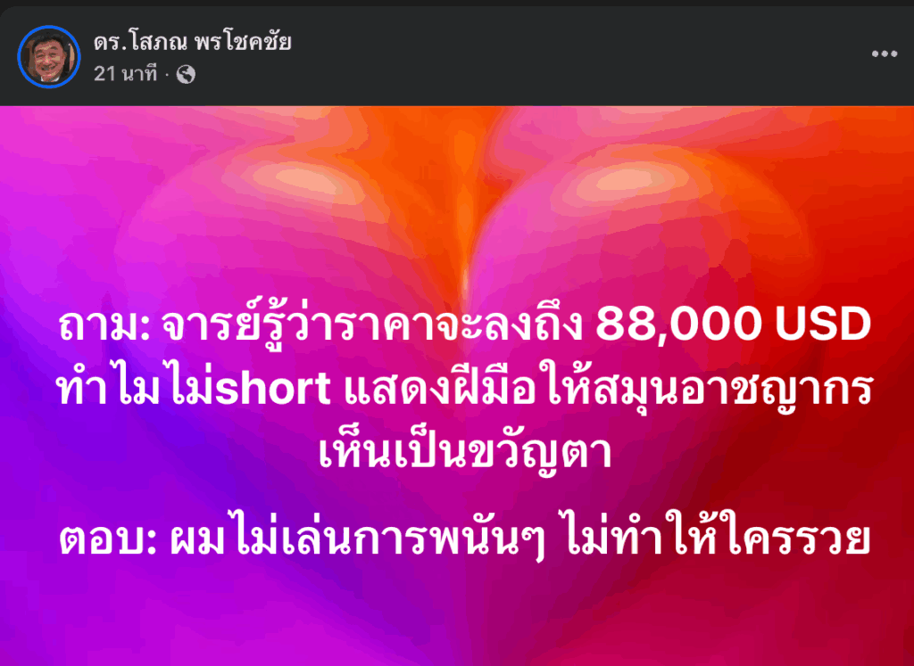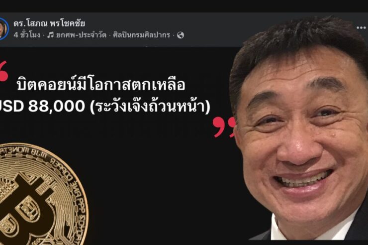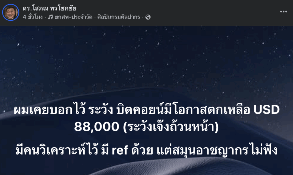 ดร.โสภณ พรโชคชัย กูรูด้านอสังหาริมทรัพย์ในประเทศไทย เมื่อไม่นานมานี้ได้ออกมาโพสต์ประกาศชัยชนะ หลังจากที่ราคา Bitcoin ได้ร่วงลงมาแตะ $88,000 ตามที่เขาเคยได้ย้ำเตือนเอาไว้