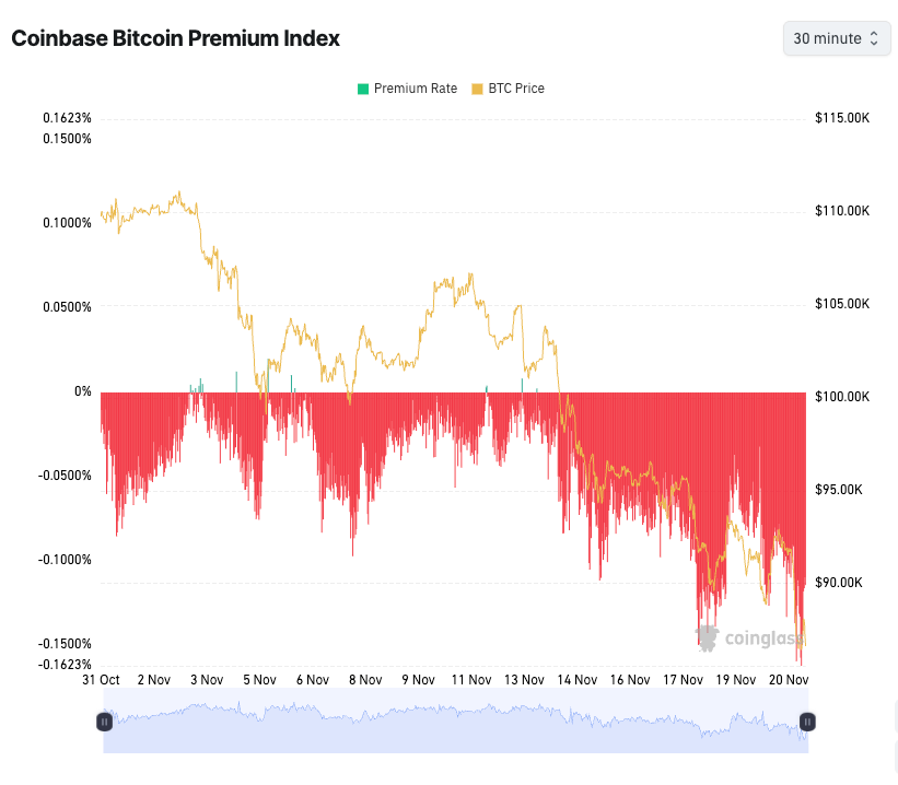 ดัชนี Coinbase Premium ซึ่งสะท้อนความเชื่อมั่นของสถาบันในสหรัฐฯ ยังคงอยู่ในแดนลบเกือบตลอดทั้งเดือนพฤศจิกายน ที่มา: Coinglass