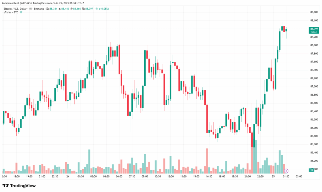 อานิสงส์เชิงบวกจากภาคเทคโนโลยีได้ส่งผ่านโดยตรงมายังตลาดสินทรัพย์ดิจิทัล ทำให้ Bitcoin ฟื้นตัวจากการเทขายหนักเมื่อสัปดาห์ก่อน กลับมายืนที่ระดับประมาณ 88,000 ดอลลาร์ (จากจุดต่ำสุดที่เกือบหลุด 80,000 ดอลลาร์) ขณะที่ Ethereum (ETH) ก็ขยับขึ้น 5% มาอยู่ที่ 2,940 ดอลลาร์