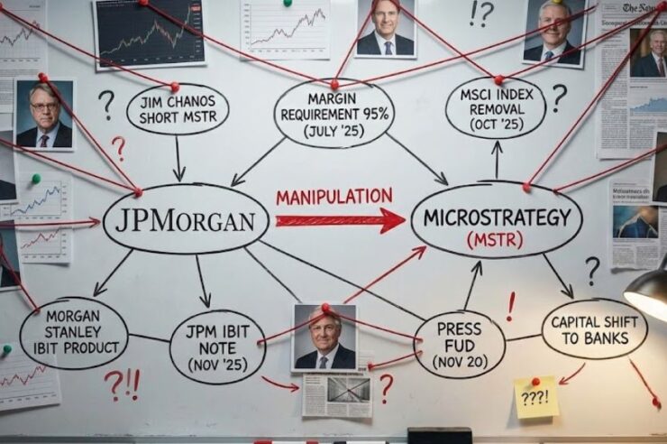 จังหวะเวลาที่น่าสงสัยที่สุดเกิดขึ้นในวันที่ 20 พฤศจิกายน เมื่อ JPMorgan ได้เผยแพร่เอกสารสำหรับผลิตภัณฑ์ทางการเงินที่เชื่อมโยงกับ IBIT ของตนเอง และในวันเดียวกันนั้นเอง JPMorgan ก็ได้นำประเด็นความเสี่ยงที่ MSTR จะถูกถอดออกจากดัชนี MSCI (ซึ่งเป็นประเด็นเก่าตั้งแต่เดือนที่แล้ว) กลับมาพูดถึงอีกครั้งในช่วงเวลาที่ราคา MSTR และ Bitcoin กำลังอยู่ในช่วงที่เปราะบางที่สุด