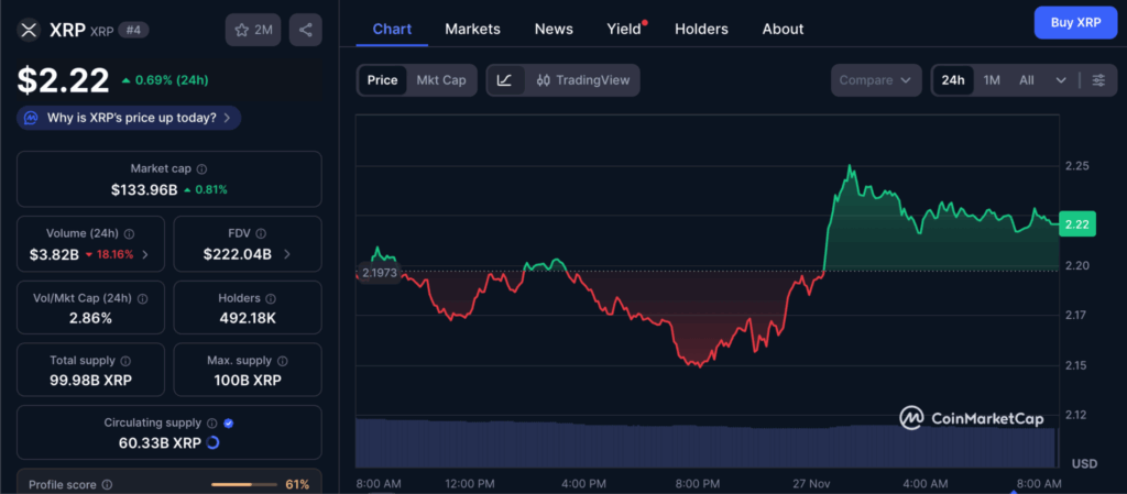 ในที่รายงาน ราคา XRP กำลังซื้อขายอยู่ที่ 2.22 ดอลลาร์ เพิ่มขึ้น 0.69% ภายใน 24 ชั่วโมง อ้างอิงข้อมูลจาก coinmarketcap