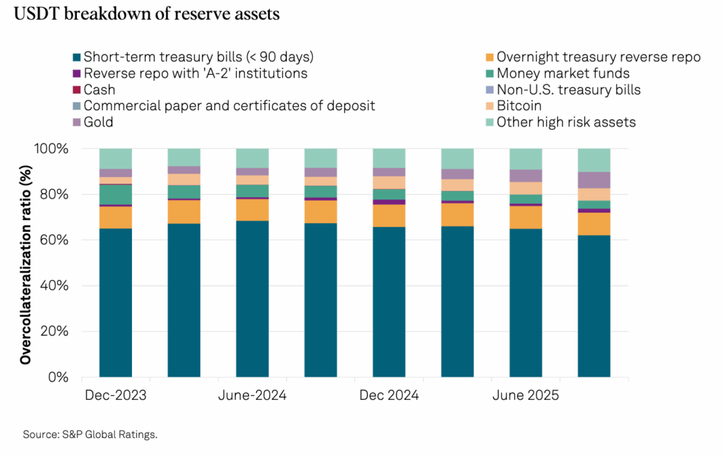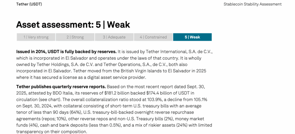 S&P ระบุว่า Tether มี Bitcoin คิดเป็น 5.6% ของสินทรัพย์หนุนหลัง ซึ่งสูงกว่า หลักประกันส่วนเกินเหนือมาร์จิ้นที่มีเพียง 3.9% ดังนั้นหากราคา Bitcoin หรือสินทรัพย์เสี่ยงอื่น ๆ ร่วงลง อาจส่งผลให้สินทรัพย์สำรอง ไม่เพียงพอต่อการครอบคลุมมูลค่าของ USDT