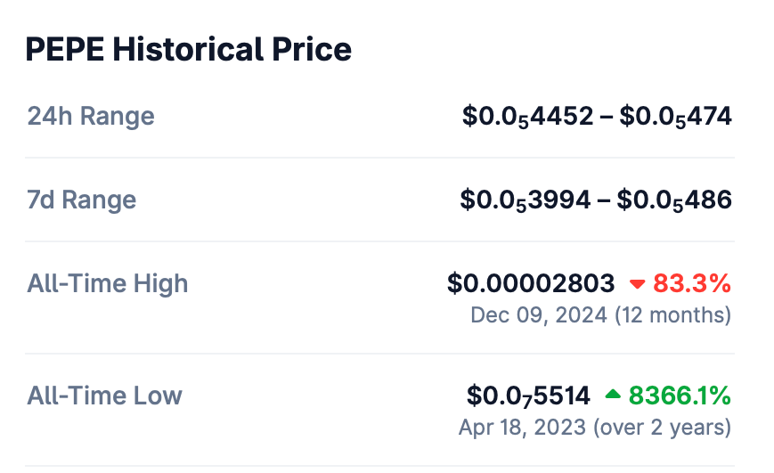 - PEPE ( Ethereum) ร่วงลง 83% จากจุดสูงสุดในเดือนธันวาคม 2024