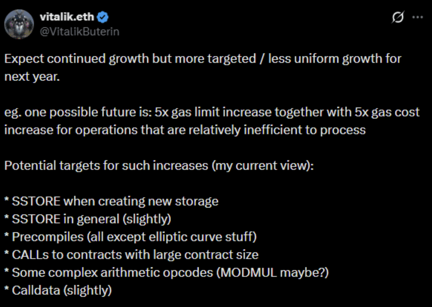 เมื่อวันที่ 26 พ.ย.ที่ผ่านมา Vitalik Buterin ผู้ร่วมก่อตั้ง Ethereum ได้ออกมาเปิดเผยวิสัยทัศน์สำหรับการ “การเติบโตแบบเจาะจงเป้าหมาย” หรือ Targeted Growth โดยตั้งเป้าที่จะเพิ่ม Gas Limit ขึ้นถึง 5 เท่าภายในปีหน้า ซึ่งถือเป็นการเดินหมากสำคัญเพื่อท้าชนคู่แข่งในเรื่องของความเร็วและต้นทุนโดยตรง