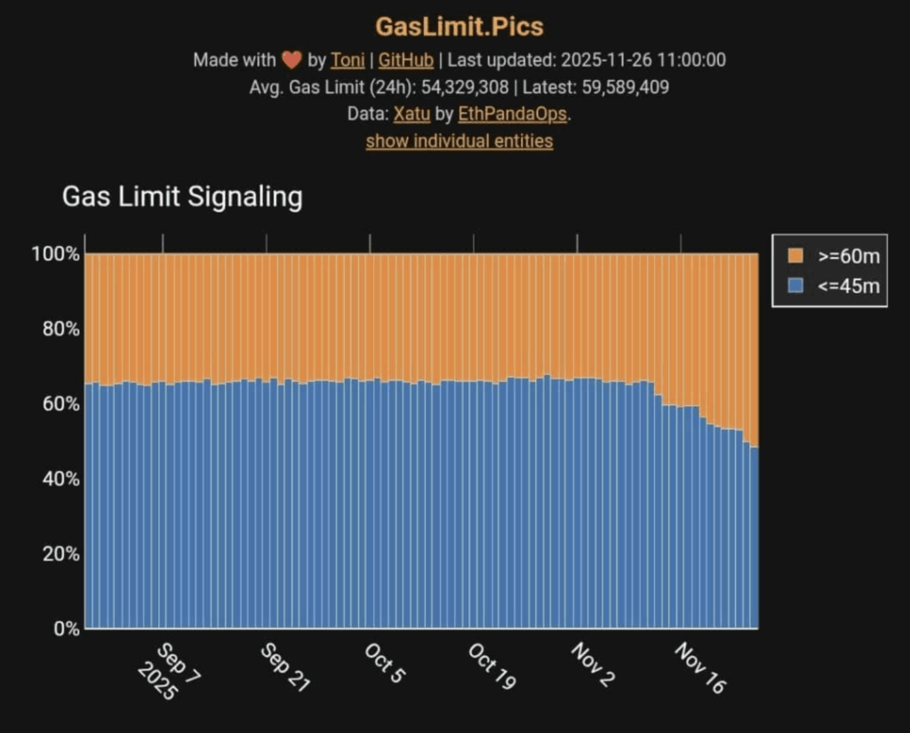 หากย้อนดูข้อมูล ณ เดือนพฤศจิกายน 2025 จะพบว่า ปัจจุบัน Gas Limit ของ Ethereum อยู่ที่ 60 ล้านหน่วยต่อบล็อก ซึ่งเพิ่มขึ้นเป็น 2 เท่าจากปีที่แล้ว ตามข้อสังเกตของ Toni Wahrstätter นักวิจัยจาก Ethereum Foundation