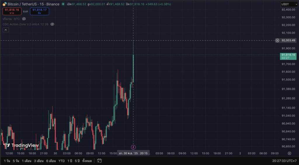 จากกราฟจะเห็นได้ว่า BTC เคลื่อนไหวสะสมแรงในช่วง 2–3 ชั่วโมงก่อนหน้า ก่อนจะเกิดการ Breakout อย่างชัดเจน ทะลุแนวต้านระยะสั้นบริเวณ 91,500 ดอลลาร์ และไม่หยุดเพียงเท่านั้น แต่เร่งตัวต่อจนแตะระดับ 92,000 ดอลลาร์