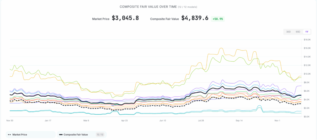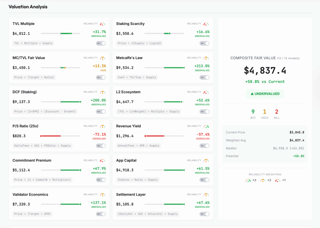 เขากล่าวว่า 9 ใน 12 ของโมเดลประเมินมูลค่าล้วยแล้วแต่แสดงให้เห็นว่า “ราคาเฉลี่ยที่เป็นธรรม” ของ Ethereum นั้นสูงถึง $4,836 ซึ่งสูงกว่าระดับราคาปัจจุบันเป็นอย่างมาก