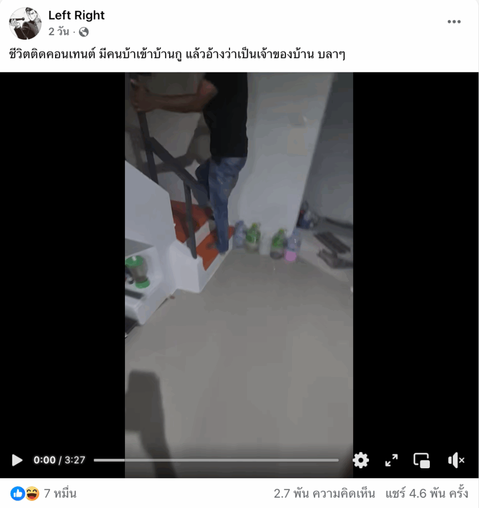 เมื่อวันที่ 28 พฤศจิกายนที่ผ่านมา หนุ่มนักสร้างอนิเมชั่น (Animator) ที่ใช้ชื่อว่า Left Right ต้องเจอเหตุการณ์พีคจนกลายเป็นไวรัล หลังโพสต์คลิปวิดีโอลงเฟซบุ๊กส่วนตัวพร้อมแคปชันว่า “ชีวิตติดคอนเทนต์ มีคนบ้าเข้าบ้านกู แล้วอ้างว่าเป็นเจ้าของบ้าน บลาๆ”
