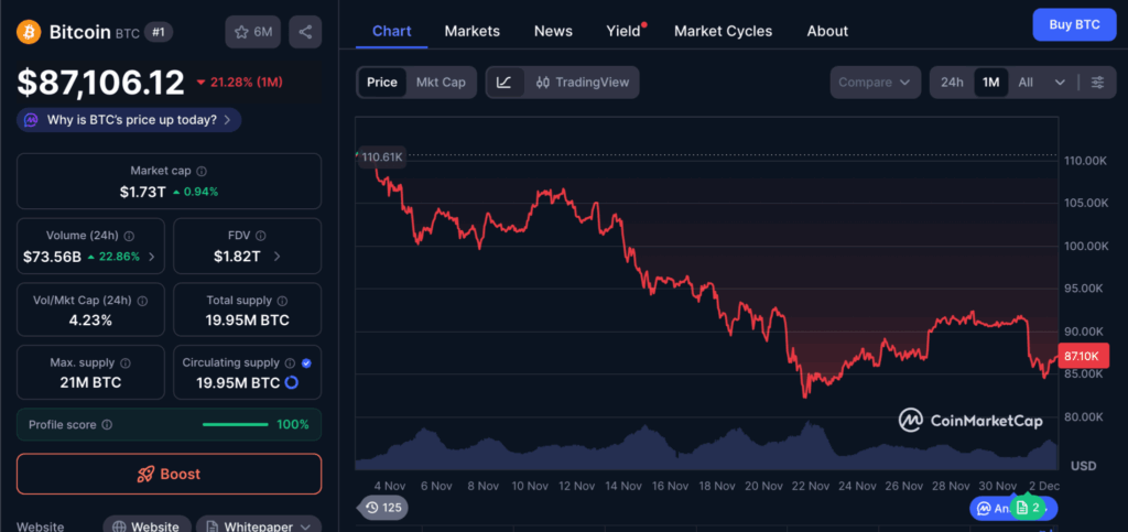 ในขณะที่รายงาน ราคา Bitcoin กำลังซื้อขายอยู่ที่ 87,106 ดอลลาร์ ลดลง 21.28% ภายใน 24 ชั่วโมง อ้างอิงข้อมูลจาก coinmarketcap