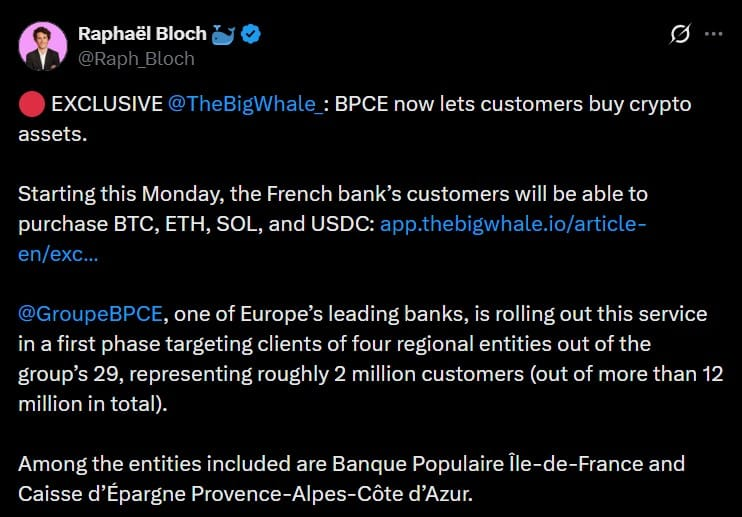 สำหรับฝั่งยุโรปนั้น สถานการณ์กลับแตกต่างไปอย่างสิ้นเชิง โดยกลุ่มธนาคารยักษ์ใหญ่ เช่น ธนาคาร BPCE ได้เปิดให้ลูกค้ากว่า 2 ล้านคน สามารถซื้อขาย Bitcoin, Ethereum, Solana, และ USDC ได้โดยตรง ภายในแอปพลิเคชันของธนาคาร ด้วยค่าธรรมเนียมที่ชัดเจน และมีระบบดูแลสินทรัพย์โดยบริษัท Hexarq ให้ ทำให้การใช้งานง่าย เหมือนแอปธนาคารทั่วไป และธนาคาร BPCE ก็ไม่ใช่รายแรก