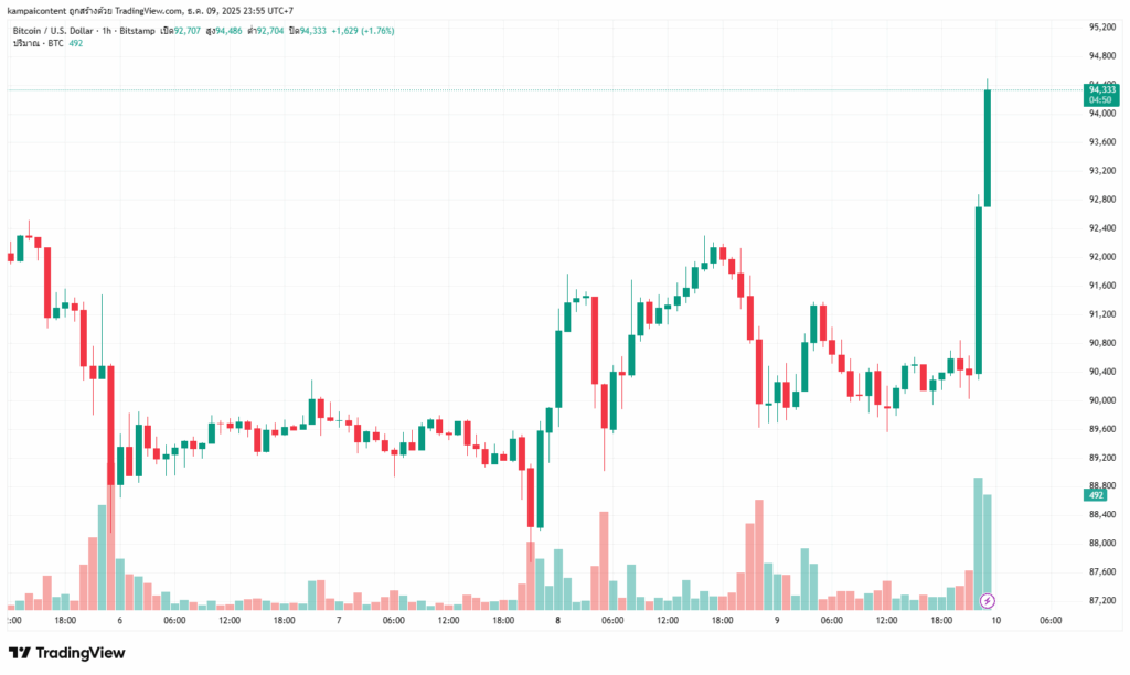 ตลาดคริปโตกลับมาคึกคักรับเดือนสุดท้ายของปี เมื่อราคา Bitcoin (BTC) พุ่งทะยานทะลุระดับ 94,000 ดอลลาร์สหรัฐ อย่างร้อนแรง โดยพุ่งขึ้นจากระดับ 90,000 ดอลลาร์อย่างรวดเร็วภายในเวลาไม่ถึงหนึ่งชั่วโมง สร้างความตื่นเต้นให้กับนักลงทุนทั่วโลกที่กำลังรอคอย “Santa Rally” หรือการปรับตัวขึ้นของตลาดในช่วงปลายปี