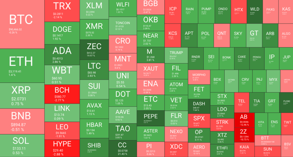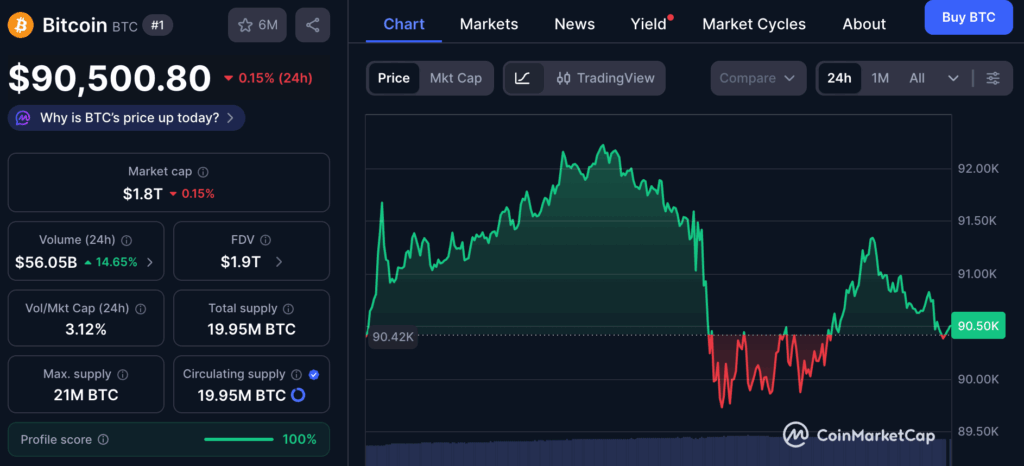 อ้างอิงข้อมูลจากกราฟ BTC/USD เผยให้เห็นว่าในช่วง 24 ชั่วโมงที่ผ่านมาราคา Bitcoin ได้พุ่งทะยานขึ้นสู่จุดสูงสุดระหว่างวันที่ $92,287 ก่อนที่จะร่วงลงมาแตะจุดต่ำสุดประมาณ $89,612 ซึ่งเป็นช่องว่างของ CME Gap และดีดตัวขึ้นมาสู่ราคา $90,500 ในขณะที่รายงาน