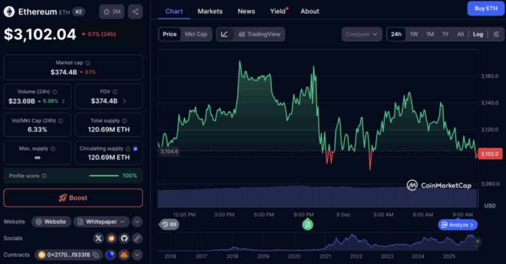 ในขณะที่รายงาน Ethereum (ETH) มีการซื้อขายกันอยู่ที่ $3,102 ลดลงเล็กน้อย 0.1% ในช่วง 24 ชั่วโมงที่ผ่านมา ตามข้อมูลจาก CoinmarketCap