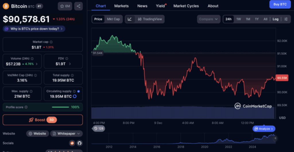 ในขณะที่รายงาน Bitcoin มีการซื้อขายกันอยู่ที่ $90,578 ลดลง 1.33% ในช่วง 24 ชั่วโมงที่ผ่านมา ตามข้อมูลจาก CoinMarketCap