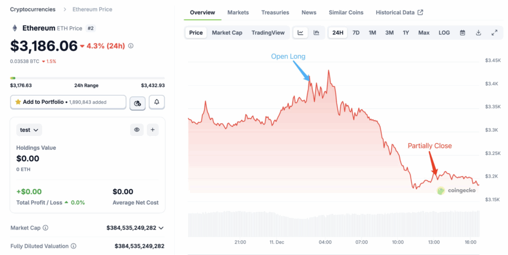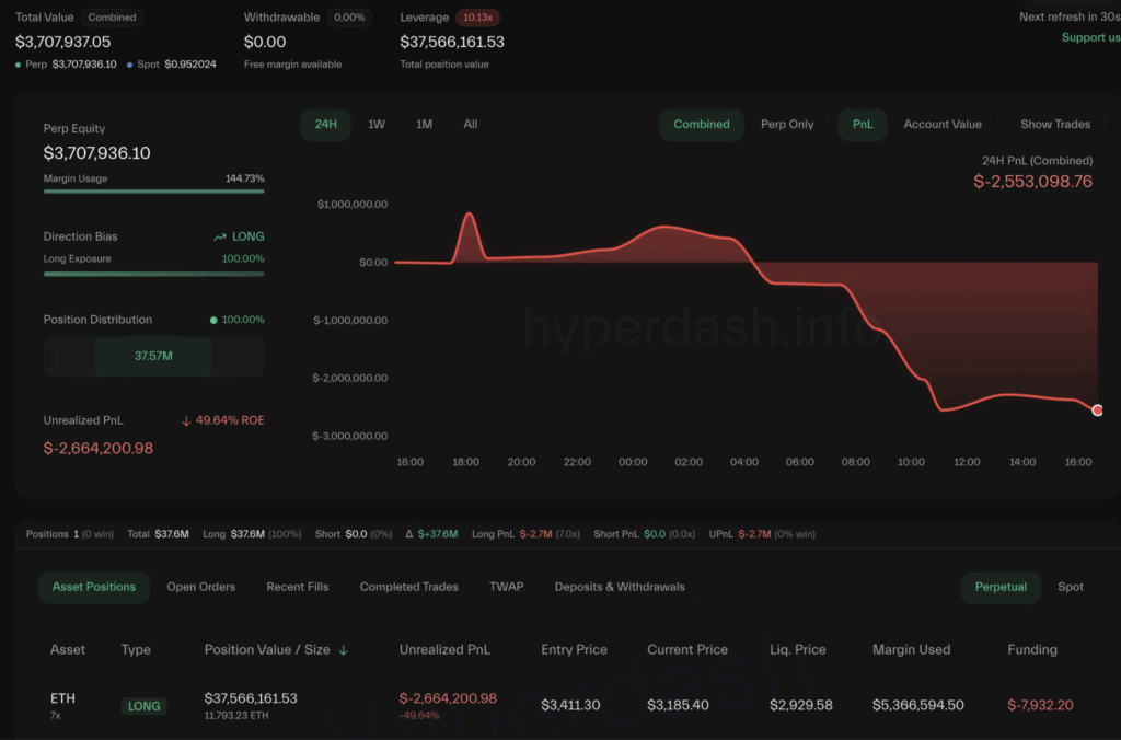 แต่แล้วฝันหวานก็กลายเป็นฝันร้าย เมื่อตลาดกลับทิศทางอย่างรวดเร็ว ราคา ETH ร่วงลงกว่า 7% มาอยู่ที่ระดับ 3,186 ดอลลาร์ ส่งผลให้พอร์ตของเขาแดงเดือดทันที ด้วยความกดดัน เขาตัดสินใจปิดสถานะบางส่วน (2,766 ETH) ไปเมื่อ 3 ชั่วโมงที่แล้ว ยอมรับการขาดทุนจริง (Realized Loss) ไปก่อน 583,500 ดอลลาร์ แต่ความเจ็บปวดยังไม่จบแค่นั้น เพราะปัจจุบันเขายังถือสถานะ Long อยู่อีกถึง 11,793 ETH (มูลค่าประมาณ 37.6 ล้านดอลลาร์) ซึ่งแบกรับการขาดทุนทางบัญชี (Unrealized Loss) อยู่อีกมหาศาลถึง 2.66 ล้านดอลลาร์