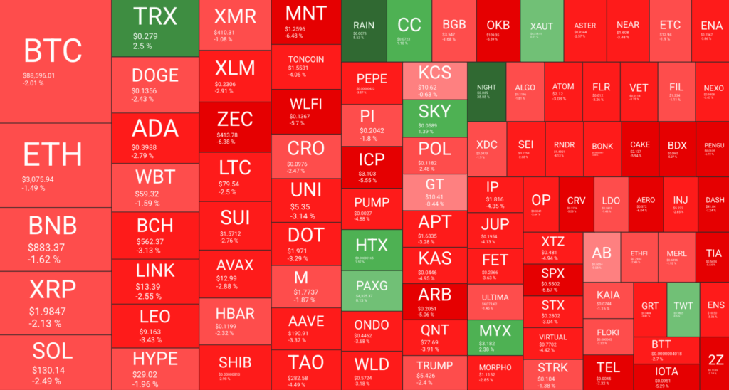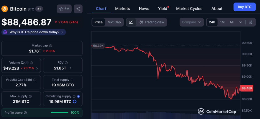 อ้างอิงข้อมูลจากกราฟ BTC/USD ราคาของ Bitcoin มีการย่อตัวลงอย่างต่อเนื่อง คิดเป็นมูลค่าที่ลดลงแล้วกว่า -2.05% ก่อนที่จะฟื้นตัวกลับขึ้นมาเล็กน้อยในช่วงเช้าวันนี้ที่ $88,485 ในขณะที่รายงาน