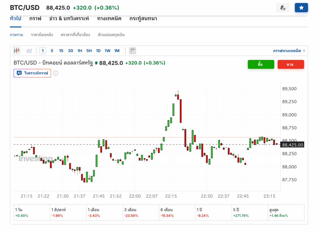 อย่างไรก็ตาม แม้จะเผชิญแรงกดดันรอบด้าน แต่กราฟล่าสุดจาก Investing.com แสดงให้เห็นว่า Bitcoin สามารถดีดตัวกลับ (Rebound) ขึ้นมาซื้อขายอยู่ที่ระดับประมาณ 88,536 ดอลลาร์ (บวก 0.49% ในวันนี้) ซึ่งแสดงให้เห็นว่าตลาดยังคงต่อสู้เพื่อรักษาระดับแนวรับสำคัญนี้ไว้ บทวิเคราะห์ทิ้งท้ายว่า การฟื้นตัวอย่างยั่งยืนจำเป็นต้องเห็นเงินทุนไหลกลับเข้าสู่ ETFs และราคาต้องกลับมายืนเหนือ 88,000 ดอลลาร์ให้ได้อย่างมั่นคง โดยมีแนวรับสำคัญถัดไปตาม Fibonacci ที่ต้องจับตาหากราคาหลุดลงไปอีกคือที่ระดับ 85,985 ดอลลาร์