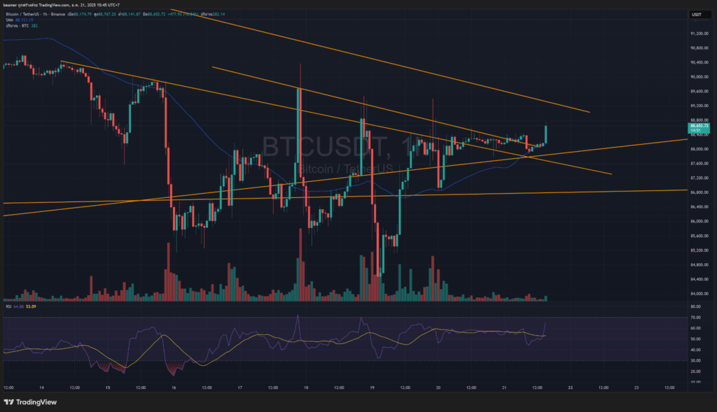 เมื่อดูจากกราฟราคา BTC จะพบว่าเหรียญได้มีการปรับขึ้นราว 0.35% ในรอบ 24 ชั่วโมง โดยมีช่วงการเคลื่อนไหวระหว่างวันอยู่ที่ประมาณ $87,800 – $88,800 ขณะที่โวลุมเทรดเริ่มเพิ่มขึ้น สะท้อนความสนใจของนักลงทุนที่กลับเข้ามาหลังการปรับฐาน