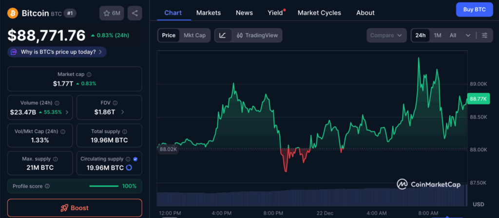 บรรยากาศการลงทุนในช่วงเช้าวันจันทร์เปิดมาอย่างสดใส Bitcoin ยังสามารถรักษาระดับราคาไว้เหนือระดับ $88,000 ดอลลาร์ ได้อย่างเหนียวแน่น โดยราคาขยับขึ้นเล็กน้อย ประมาณ 1% ตามบรรยากาศที่สดใสของตลาดการลงทุนทั่วโลก