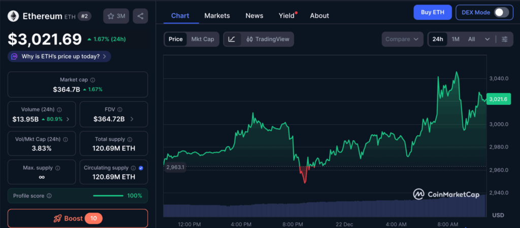 แม้รอบนี้คริปโตจะไม่ได้เป็นตัวเดินเกมหลัก แต่ภาพรวมก็ยังดูดีอยู่ โดยเฉพาะ Ethereum ที่ราคาเพิ่มขึ้น 1.67 % ภายใน 24 ชั่วโมงที่ผ่านมา จนสามารถกลับมายืนเหนือระดับ $3,000 ได้สำเร็จอีกครั้ง