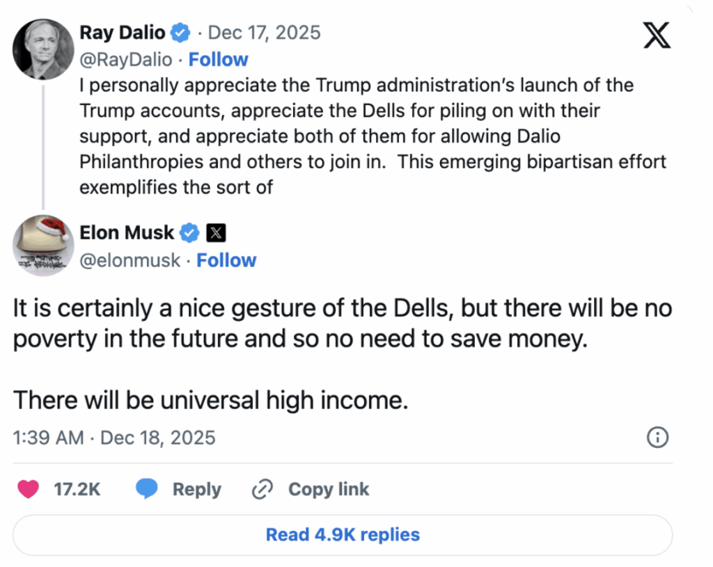คำกล่าวนี้เป็นการตอบโต้ Ray Dalio ผู้ก่อตั้ง Bridgewater Associates หลังเขาออกมายกย่องและสนับสนุนโครงการ “Trump Accounts” ซึ่งเป็นบัญชีเงินออมเพื่อเยาวชนอเมริกัน โดย Musk มองว่า ความพยายามด้านการออมในระยะยาวอาจไม่มีความหมายอีกต่อไป หากเทคโนโลยีสามารถเปลี่ยนโครงสร้างเศรษฐกิจไปตลอดกาล