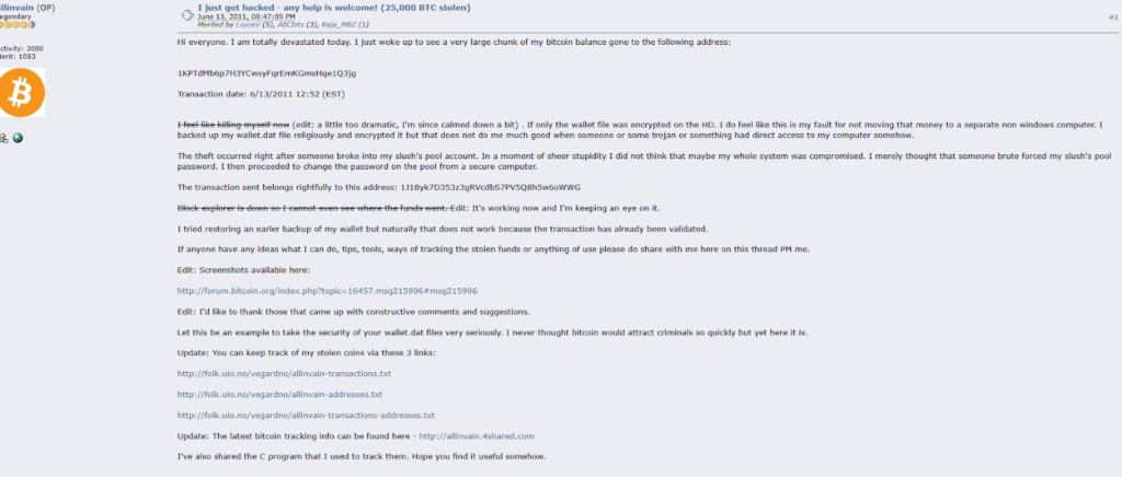 จุดเริ่มต้นของโศกนาฏกรรมนี้เกิดขึ้น ในคืนวันที่ 13 มิถุนายน 2011 “allinvain” โพสต์ข้อความพร้อมอาการช็อกว่า “ผมเพิ่งถูกแฮก… Bitcoin จำนวน 25,000 BTC ถูกโอนออกไปจากบัญชีของผม” ถ้าเป็นเรทราคาปัจจุบัน 25,000 BTC จะมีมูลค่าสูงถึง 60,000 – 70,000 ล้านบาท เลยทีเดียว แต่ในตอนนั้นมันมีมูลค่าประมาณ 500,000 ดอลลาร์ ซึ่งก็นับว่ามหาศาลมากแล้วในยุคนั้น ซื้อเหตุการณ์ที่เกิดขึ้นทำให้เขารู้สึกอยากจะจบชีวิตตัวเองลงในวินาทีแรกที่เห็นยอดเงินเป็นศูนย์