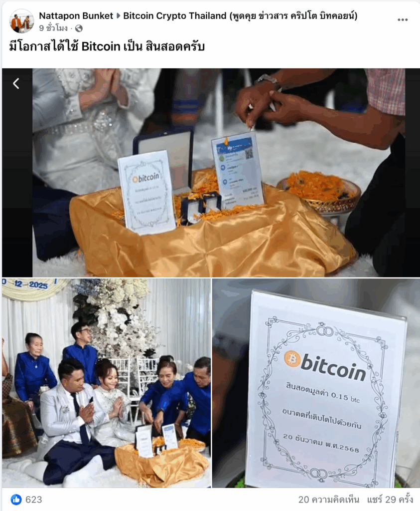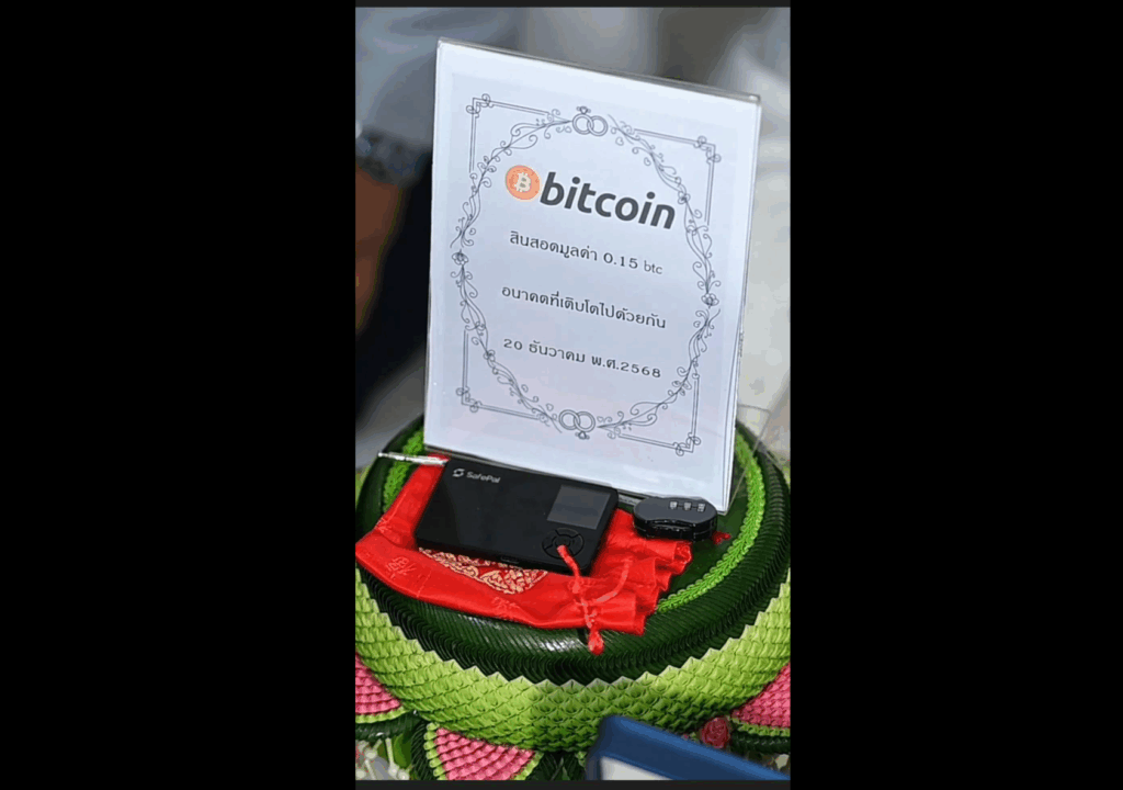 ซึ่งสิ่งที่สะดุดตาที่สุดในพิธีไม่ใช่เพียงแค่ตัวเลข แต่คือป้ายตั้งโชว์สินสอดที่ระบุจำนวน 0.15 BTC พร้อมข้อความลึกซึ้งที่ว่า “อนาคตที่เติบโตไปด้วยกัน”
