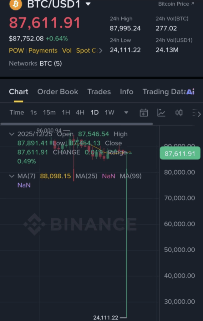 เมื่อวันที่ 24 ธ.ค. ที่ผ่านมา ราคา Bitcoin ในคู่เหรียญ BTC/USD1 บนกระดานเทรด Binance แสดงให้เห็นกราฟ ไส้เทียนมีความยาวผิดปกติ เนื่องจากราคาเกิดการดิ่งลงไปเหลือ $24,111 ชั่วคราว ตอนเวลาประมาณ 16.15 น. ก่อนดีดกลับขึ้นมายืนเหนือ $87,000 ในไม่กี่วินาทีต่อมา