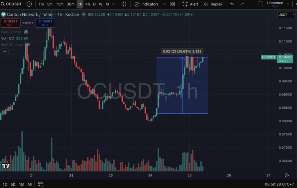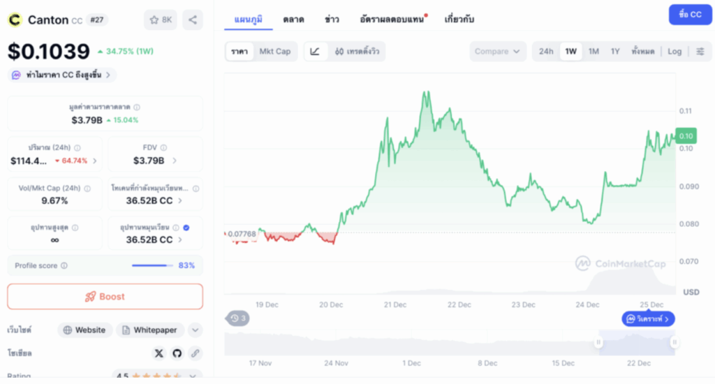 ในขณะที่รายงาน Canton (CC) มีการซื้อขาย $0.1039 ปรับตัวขึ้น 34.75% ในช่วง 7 วันที่ผ่านมา ตามข้อมูลจาก CoinMarketCap