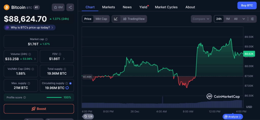 ในขณะที่รายงาน ราคา Bitcoin กำลังซื้อขายอยู่ที่ 88,624 ดอลลาร์ เพิ่มขึ้น 1.37% ภายใน 24 ชั่วโมง อ้างอิงข้อมูลจาก coinmarketcap