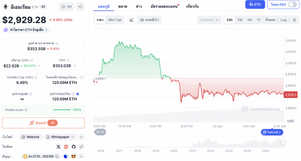 ในขณะที่รายงาน Ethreum (ETH) มีการซื้อขายกันอยู่ที่ $2,929 ลดลง 0.98% ช่วง 24 ชั่วโมงที่ผ่านมา ตามข้อมูลจาก CoinMarketCap