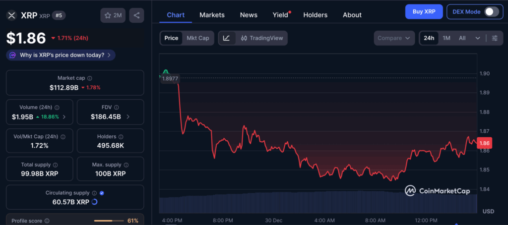ในขณะที่รายงาน ราคา XRP กำลังซื้อขายอยู่ที่ 1.86% ภายใน 24 ชั่วโมง อ้างอิงข้อมูลจาก coinmarketcap