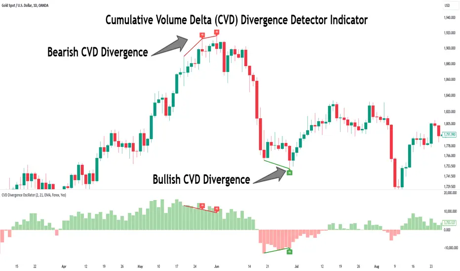 1. Volume Delta / CVD (Cumulative Volume Delta) หาได้ใน TradingView โดยค้นหา “Volume Delta” หรือ “CVD” ในส่วน Indicators อินดิเคเตอร์นี้จะบอกความจริงของแรงซื้อ-ขายที่เกิดขึ้นจริงในตลาด ไม่ใช่แค่ปริมาณการซื้อขายรวม แต่จะแสดงให้เห็นว่าออเดอร์ซื้อหรือขายมีแรงมากกว่ากัน โดยการคำนวณผลต่างระหว่างปริมาณที่ซื้อและขายแบบสะสม ในการใช้งานให้ลองเปิด Indicator ชื่อ “Cumulative Volume Delta” หรือ “Volume Delta” บน TradingView แล้วสังเกตเวลาที่ราคาขึ้นแต่ CVD ลง หรือราคาลงแต่ CVD ขึ้น ซึ่งบ่งบอกถึง Divergence ที่อาจเกิดการกลับตัวของเทรนด์