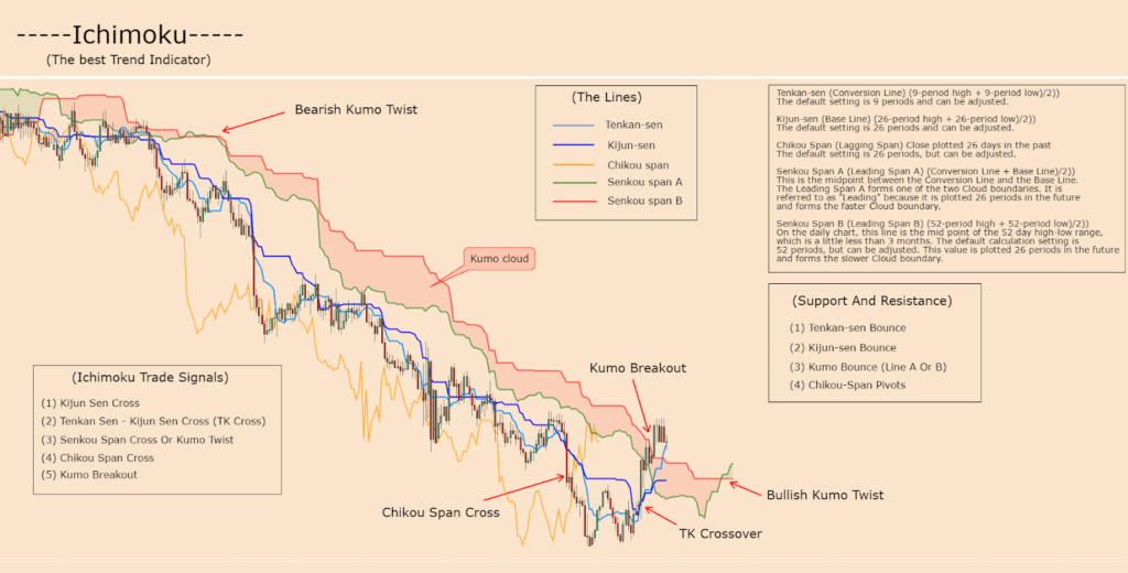 5. Ichimoku Cloud (Ichimoku Kinko Hyo) อินดิเคเตอร์ญี่ปุ่นที่ดูซับซ้อนแต่ทรงพลังมาก หาได้ง่ายใน TradingView โดยค้นหา “Ichimoku Cloud” ประกอบด้วย 5 เส้นที่บอกทั้ง Trend, Support/Resistance, และ Momentum ในตัวเดียว นักเทรด Crypto มืออาชีพมักใช้ Ichimoku เพื่อดู Trend โดยรวม โดยเมื่อราคาอยู่เหนือ Cloud เป็น Bullish ใต้ Cloud เป็น Bearish และการที่ Tenkan-sen (เส้นสีฟ้า) ตัดขึ้น Kijun-sen (เส้นสีแดง) เป็นสัญญาณซื้อ สิ่งที่หลายคนไม่รู้คือ Chikou Span (เส้นสีเขียว) ถ้าอยู่เหนือราคา 26 วันก่อนก็ยืนยัน Bullish Trend ได้
