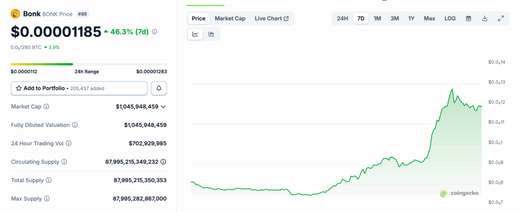 ในขณะที่ Bonk ราคาก็เพิ่มขึ้นกว่า 46.3 % ภายใน 7 วัน โดยในขณะที่รายงาน ราคาซื้อขายอยู่ที่ $0.00001185 ดอลลาร์