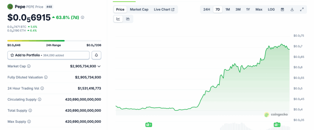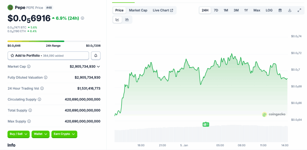 ข้อมูลล่าสุดจาก CoinGecko ยืนยันว่า เหรียญมีมตัวท็อปกำลังพากันเด้งแรง รับต้นปี 2026 โดยในรอบสัปดาห์ที่ผ่านมา พี่ใหญ่อย่าง Dogecoin (DOGE) ปรับตัวขึ้นถึง 20% ตามมาด้วย Shiba Inu (SHIB) ที่บวกเพิ่ม 18.9% แต่ที่เซอร์ไพรส์ที่สุดต้องยกให้ Pepe (PEPE) ที่ราคาพุ่งทะยานอย่างรุนแรงถึง 62.8 % ในช่วง 7 วันที่ผ่านมา และราคาเพิ่มขึ้นกว่า 6.9% ภายใน 24 ชั่วโมงที่ผ่านมา