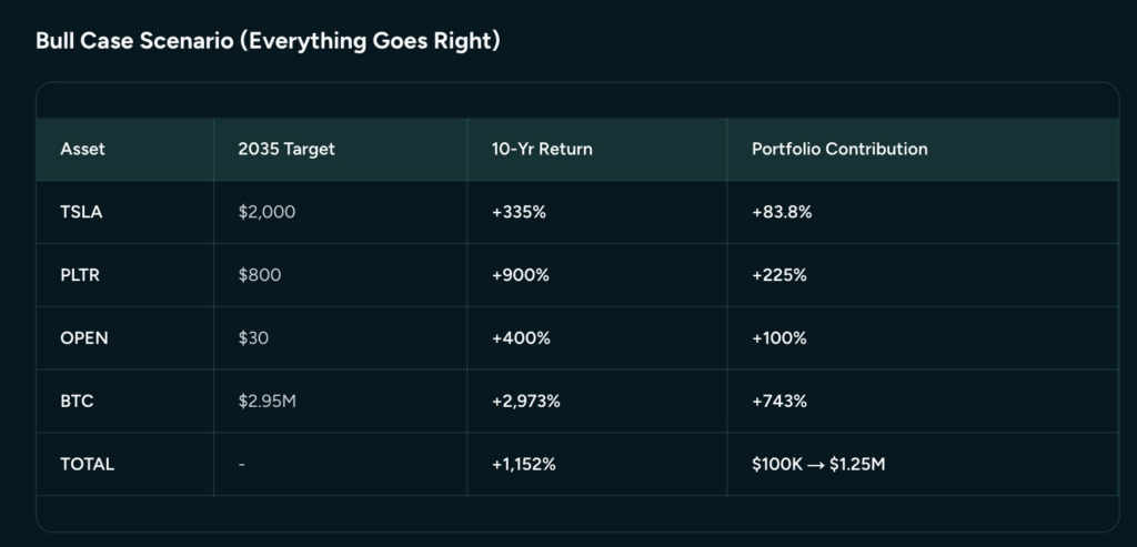- กรณีฟ้าเป็นใจ (Bull Case): หากตลาดเป็นกระทิงดุ เงินต้น $100,000 จะโตระเบิดกลายเป็น $1.25 ล้าน (เติบโต 1,250%) เปลี่ยนสถานะคุณให้กลายเป็นเศรษฐีได้ใน 10 ปี