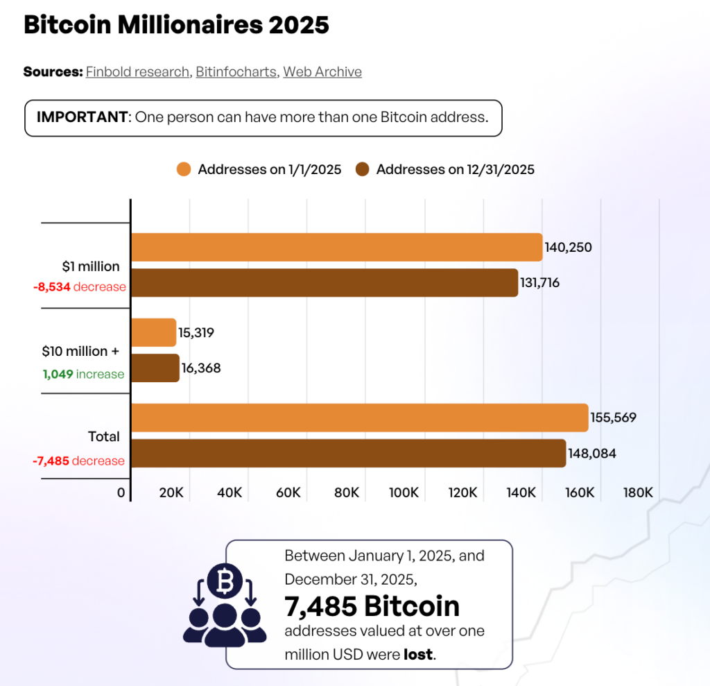 ข้อมูล On-chain ฟ้องชัดเจนว่า ณ สิ้นปี 2025 จำนวนกระเป๋าคริปโตที่ถือครอง Bitcoin มูลค่า 1 ล้านดอลลาร์ขึ้นไป ลดฮวบลงจาก 155,569 เหลือ 148,084 บัญชี เท่ากับว่า มีนักลงทุนคริปโตหลุดออกจากสถานะ ‘เศรษฐีเงินล้าน’ เฉลี่ยถึงวันละ 21 คน สวนทางกับปี 2024 ที่เคยสร้างเศรษฐีหน้าใหม่ได้อย่างต่อเนื่อง