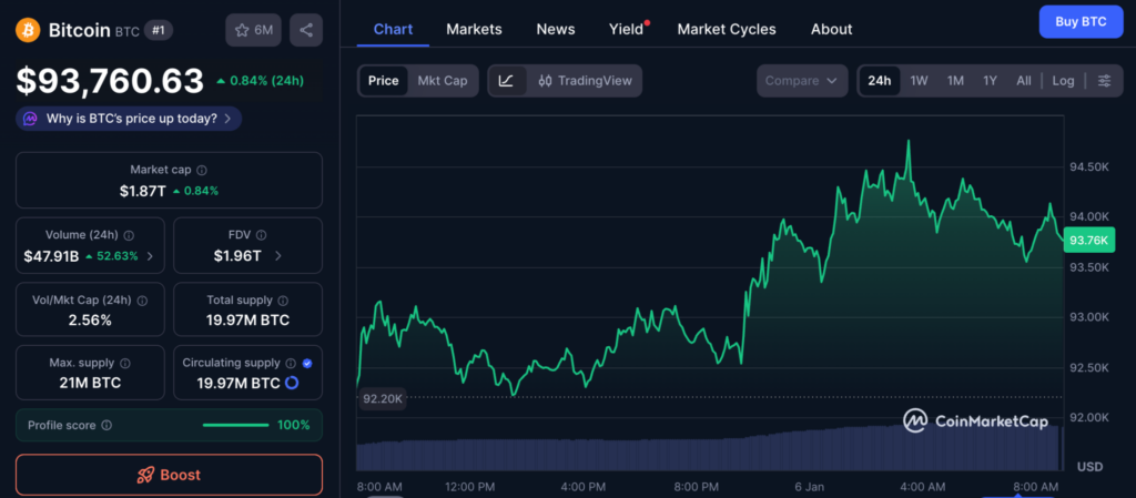 ในขณะที่รายงาน ราคา Bitcoin กำลังซื้อขายอยู่ที่ 93,760 ดอลลาร์ เพิ่มขึ้น 0.84% ภายใน 24 ชั่วโมง อ้างอิงข้อมูลจาก coinmarketcap