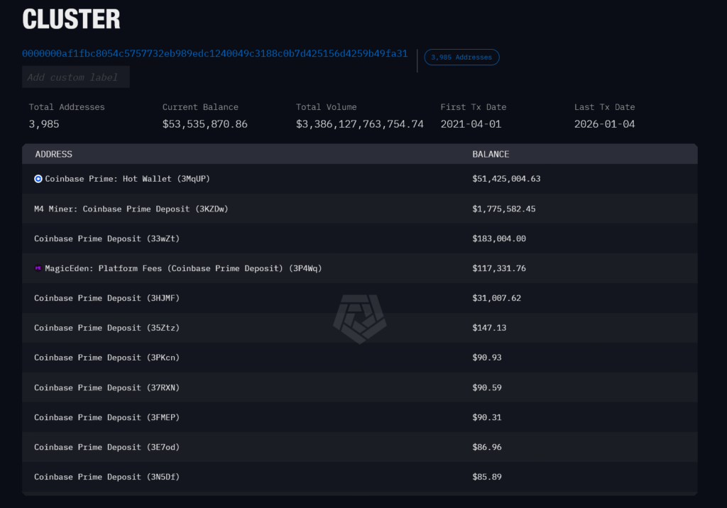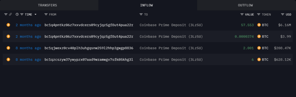 ย้อนกลับไปเมื่อวันที่ 3 พฤศจิกายน 2025 มีการโอน BTC ประมาณ 57.553 จากที่อยู่ bech32 ที่เกี่ยวข้องกับการยึดทรัพย์ Samourai Wallet ไปยังกระเป๋าเงินที่มีชื่อว่า Coinbase Prime Deposit (3Lz5U)