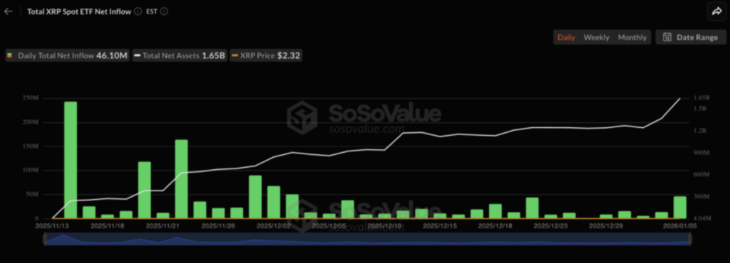 ข้อมูลล่าสุดจาก SoSoValue รายงานว่า เฉพาะวันที่ 5 มกราคม 2026 เพียงวันเดียว XRP ETF มียอดเงินไหลเข้าสุทธิ 46.1 ล้านดอลลาร์ ส่งผลให้ยอดเงินไหลเข้าสะสมตั้งแต่เปิดตัวพุ่งแตะราว 1.23 พันล้านดอลลาร์ ขณะที่มูลค่าสินทรัพย์สุทธิรวมของกองทุนอยู่ที่เกือบ 1.65 พันล้านดอลลาร์