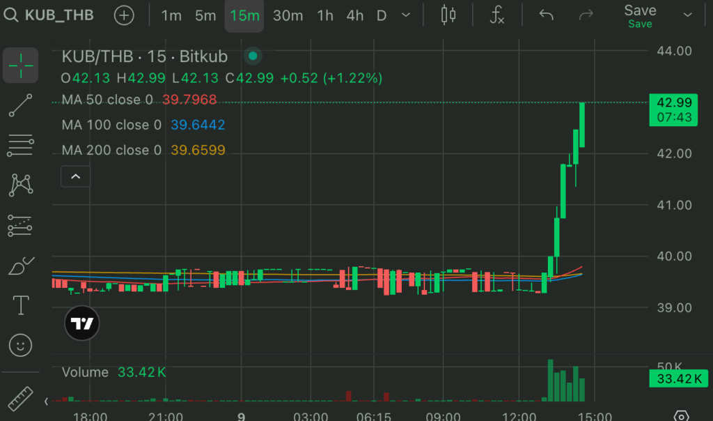 อ้างอิงข้อมูลจากกราฟ KUB/THB บน Bitkub แสดงให้เห็นว่า ราคาเหรียญได้มีการปรับตัวพุ่งสูงขึ้นอย่างรวดเร็วจาก 39.2 บาท ขึ้นมาถึง 43 บาท หลังจากประกาศบิ๊กเซอร์ไพรส์เริ่มแพร่สะพัดออกไป
